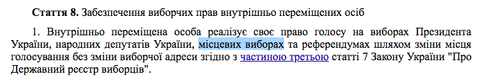 Что же касается Закона об обеспечении прав и свобод ВПЛ, который был принят Верховной Радой в 2015 году, действительно, в нем содержится норма о праве вынужденных переселенцев голосовать на местных выборах.