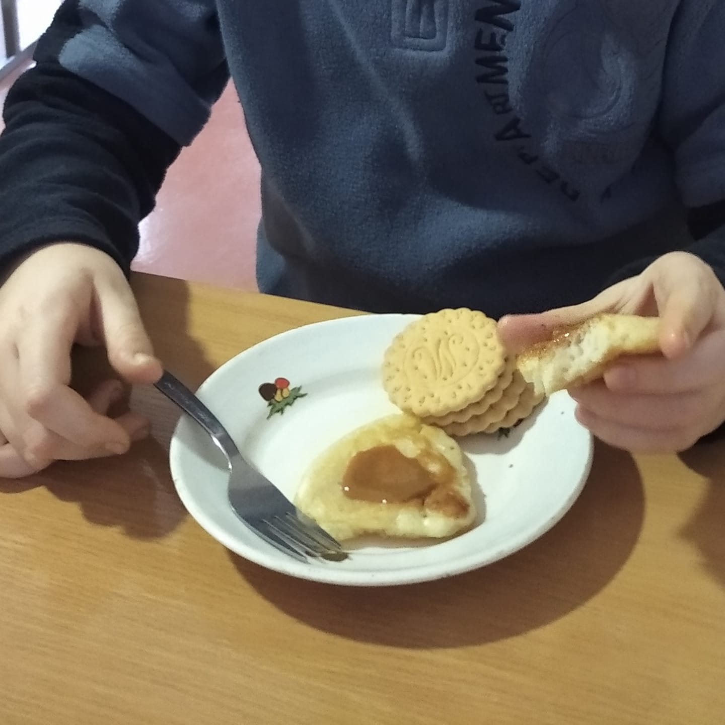 Вот еще пример, как на самом деле выглядит так называемый горячий школьный обед после реформы: оладьи, смазанные сгущенкой неизвестного происхождения, четыре печенья "Мария" и стакан чая. Цена обеда - 18 грн.