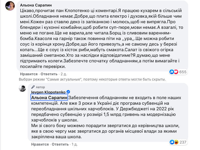 На те же проблемы обращают внимание Клопотенко повара в комментариях под его постом. Он же в ответ советует поварам обращаться с просьбой купить оборудование к директору школы, а тот должен обратиться к органам местной власти.