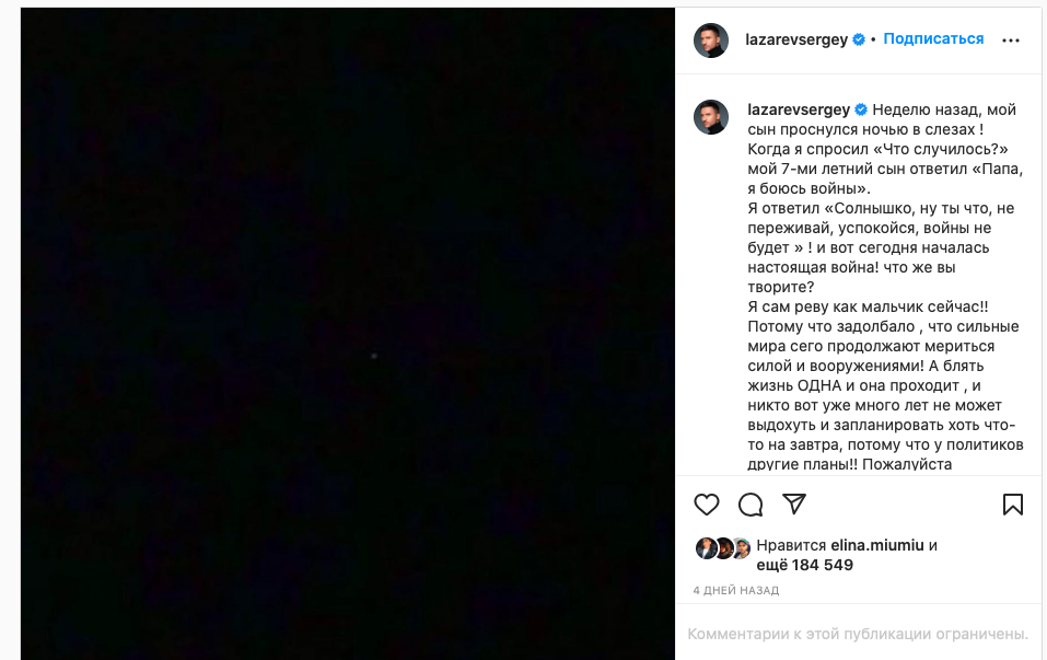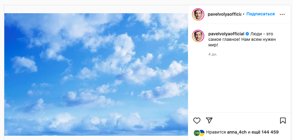 Его коллега, комик Павел Воля, высказался в похожем ключе. Он обошелся без хэштегов и ограничился всего двумя предложениями о войне: "Люди - это самое главное! Нам всем нужен мир!". Примечательно, что комментарии под этим постом он закрыл.