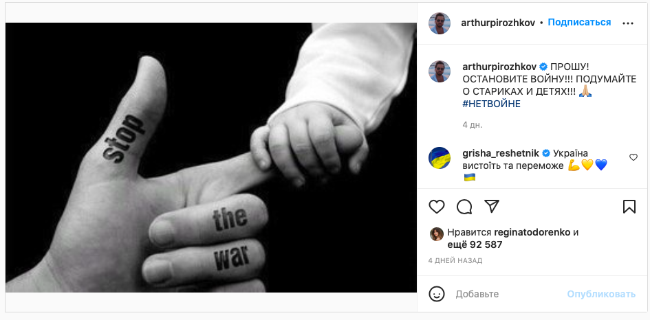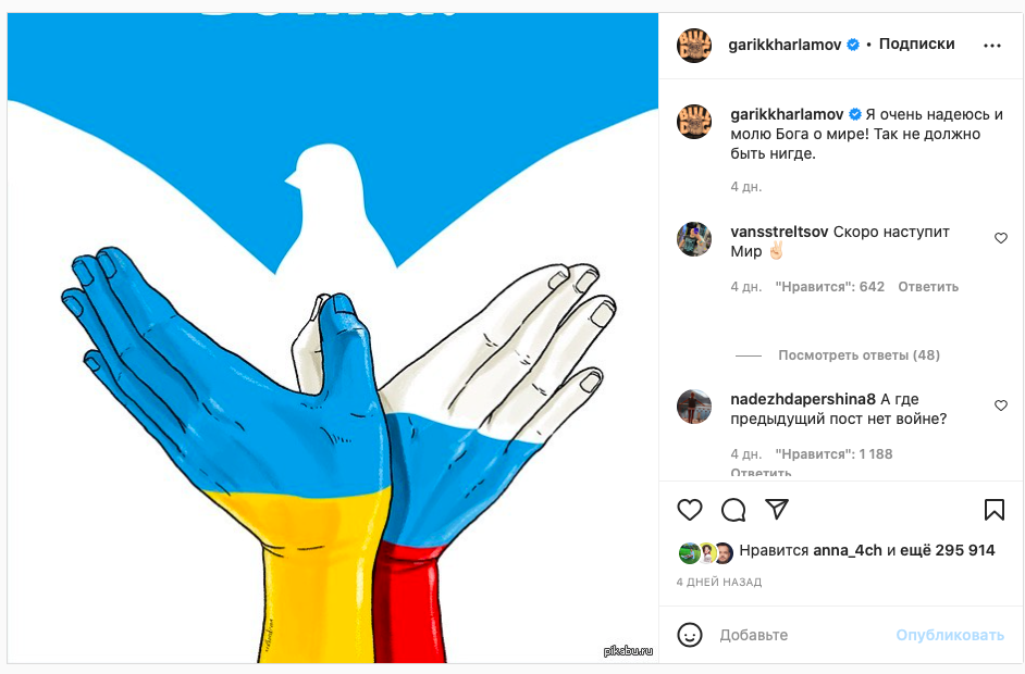 Однако посты с такой же картинкой выставляют те звезды, которые считают, что Путин "освобождает Украину" и оправдывают его действия. В то же время несколько дней певец никак не высказывался о войне - ни за, ни против.