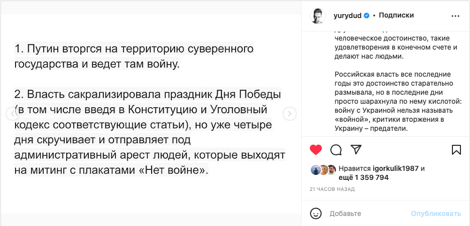 Популярный журналист и блогер Юрий Дудь еще до вторжения в Украины называл Путина "увлекшимся историей императором". Когда война уже началась, он не побоялся прямо назвать происходящее вторжением на территорию суверенного государства и осудил развязанную Путиным войну.