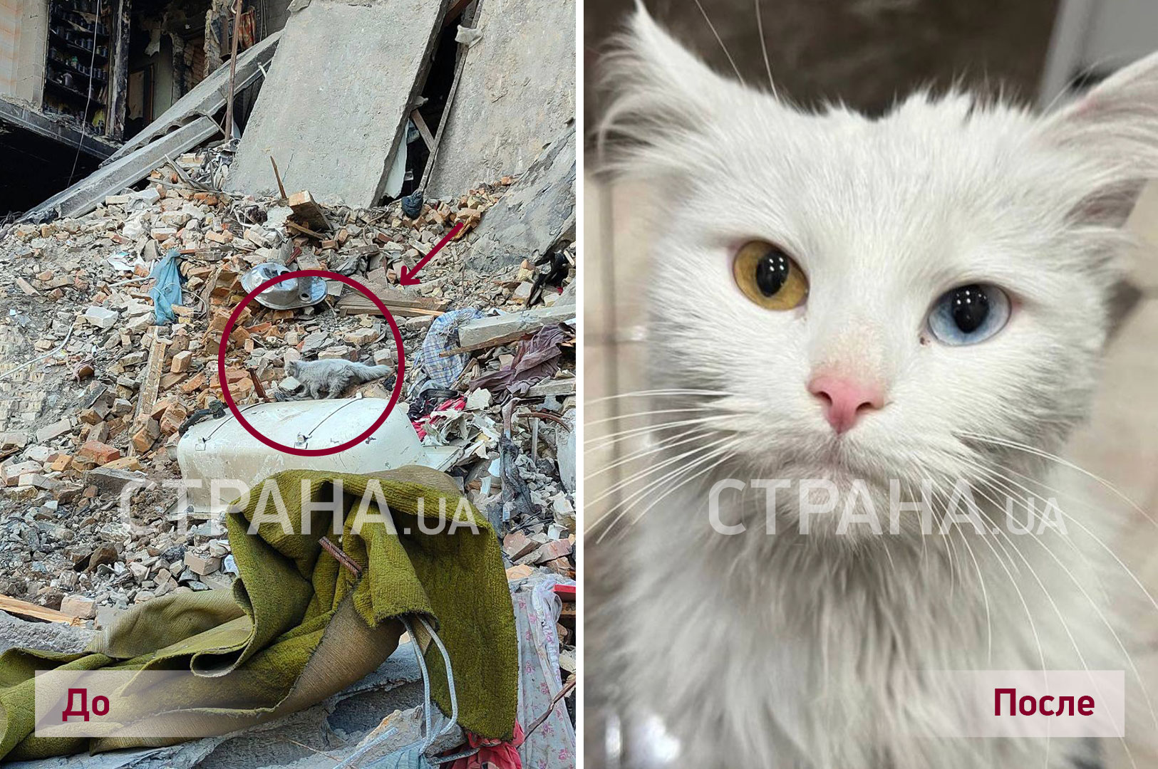 "Когда ее искупали, то увидели, что она удивительно красивая: у неё полностью белоснежная шерсть, а глаза цвета украинского флага: один желтый, а второй — голубой. Но из-за того, что вначале она была пепельного оттенка, мы назвали ее Эшли, потому что пепел на английском "ash". Она уже белоснежная, но пепел как воспоминание о пережитом остался в ее имени", — сказал Евгений.