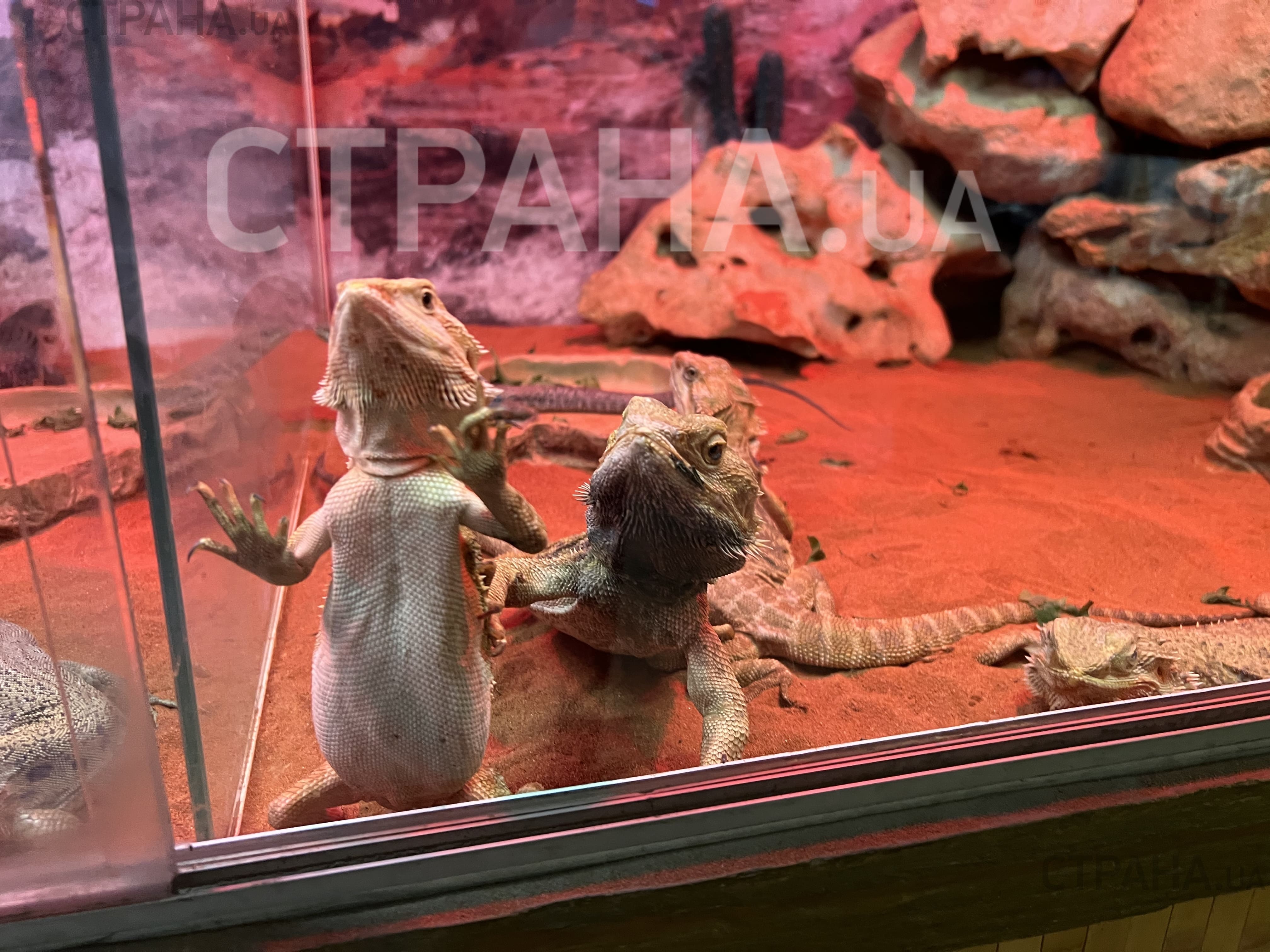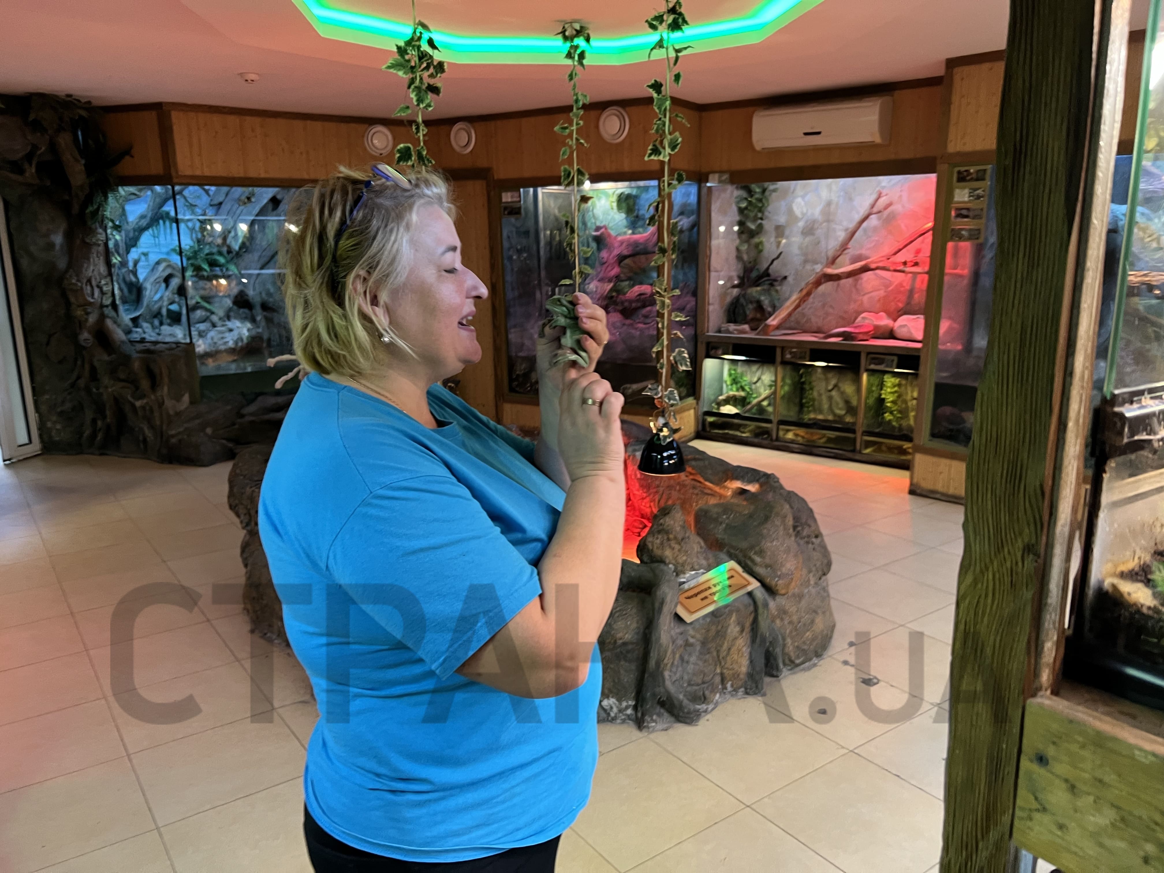 — Здесь же у нас геконы, хамелеоны, змеи, ящерицы, жабы, крокодил Семен. Вот смотрите, они не опасные и ручные, — говорит женщина, вынув из стеклянного аквариума большую зелёную жабу Квакшу.