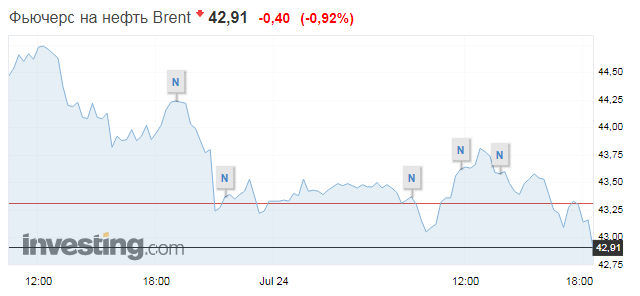 Так, по состоянию на 18:37 по Киеву котировки контрактов на сентябрь на нефть Brent в ходе торгов на лондонской бирже ICE Futures достигли $42,91 за баррель. Это на $0,40 (0,92%) ниже цены закрытия предыдущей сессии.