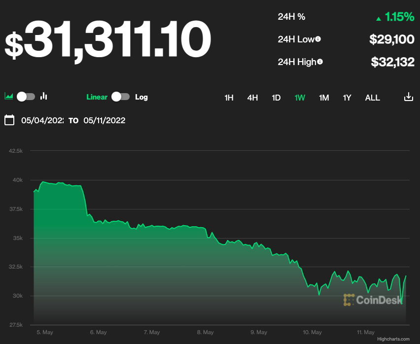 Курс биткоина продолжает падать, и уже достиг отметки в 31,3 тыс. долларов по состоянию на 18 часов по Киеву.