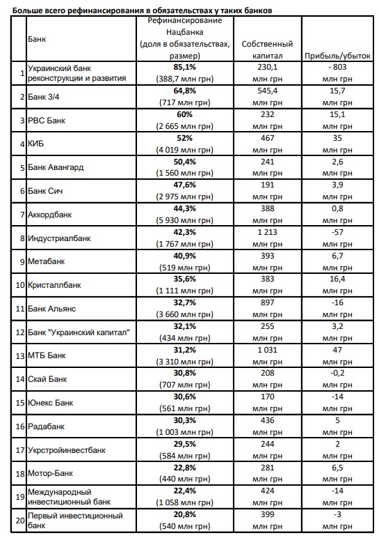Из данных видно, что ряд банков находятся в тотальной зависимости от денег НБУ, при этом немного зарабатывают или вообще несут убытки и имеют мало собственных средств (собственного капитала) - он в 2-3 раза меньше одолженного у Нацбанка. Что очень плохо и даже опасно для регулятора. Если финучреждение придется закрывать, то Национальный банк не сможет вернуть все, что одолжил.