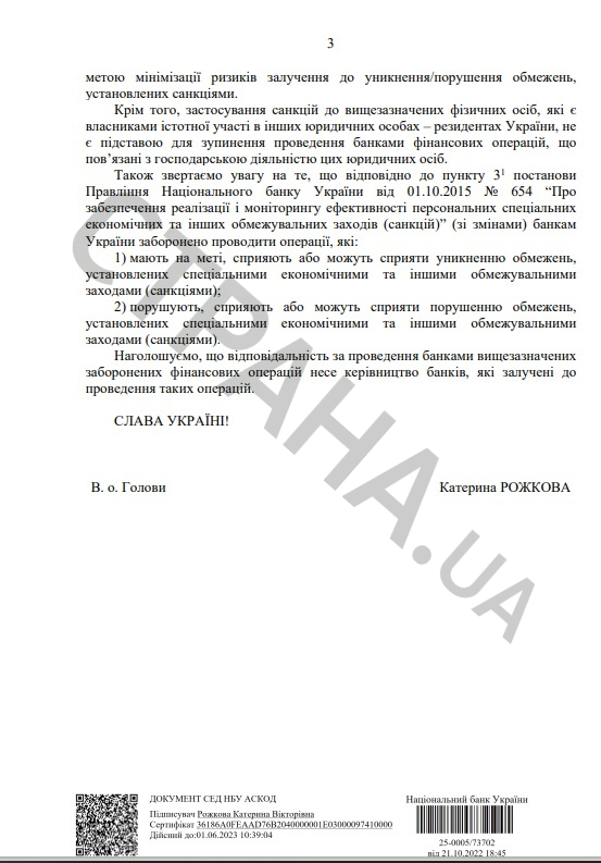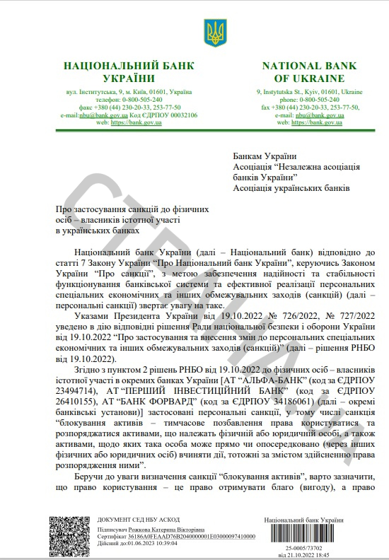 В документе Нацбанка отмечается, что 19 октября 2022 года Указами Президента (№726/2022 и №727/2022) были введены в силу решения Совета Нацбезопасности и обороны о специальных экономических и других ограничений санкциях в отношении акционеров трех банков: