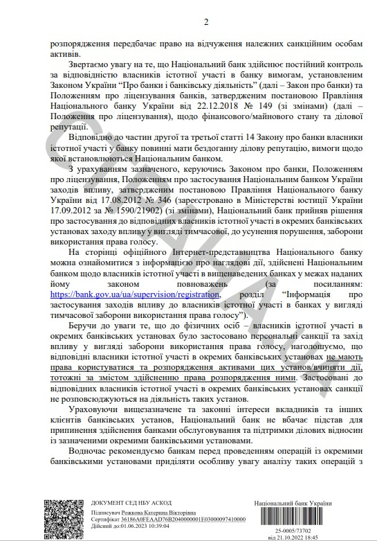 "Принимая во внимание то, что к физическим лицам – владельцам существенного участия в отдельных банковских учреждениях были применены персональные санкции и мероприятие влияния в виде запрета на использование права голоса, подчеркиваем, что соответствующие владельцы существенного участия в отдельных банковских учреждениях не имеют права пользоваться и распоряжение активами этих учреждений/совершать действия, тождественные по содержанию осуществлению права распоряжения ими", - подчеркивается в письме НБУ №25-0005/73702.