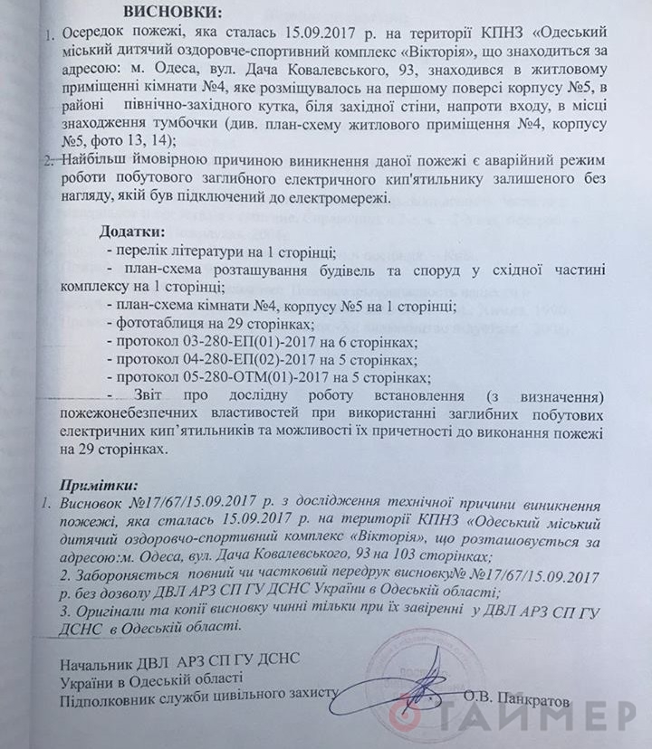 Документ подписан начальником исследовательско-испытательной лаборатории Главного управления Госслужбы по чрезвычайным ситуациям Украины в Одесской области О.Панкратовым.