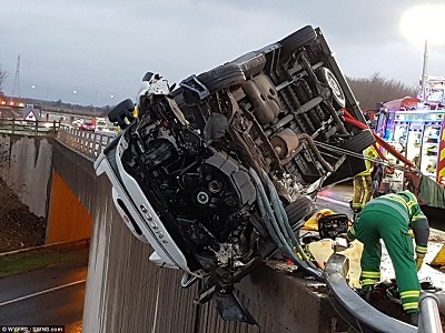ЧП произошло в графстве Уэст-Йоркшир, рядом с городом Лидс. Водитель фургона не справился с управлением, его машина перевернулась и чуть не упала с моста.