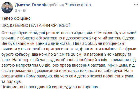 "На данное время судом избрана мера пресечения - содержание под стражей в течение 60 суток без права внесения залога. Между тем, во время задержания подозреваемый пытался покончить жизнь самоубийством. Наш оперативник ему помешал, от чего сам получил ножевые ранения руки и пальцев", - написал Головин.