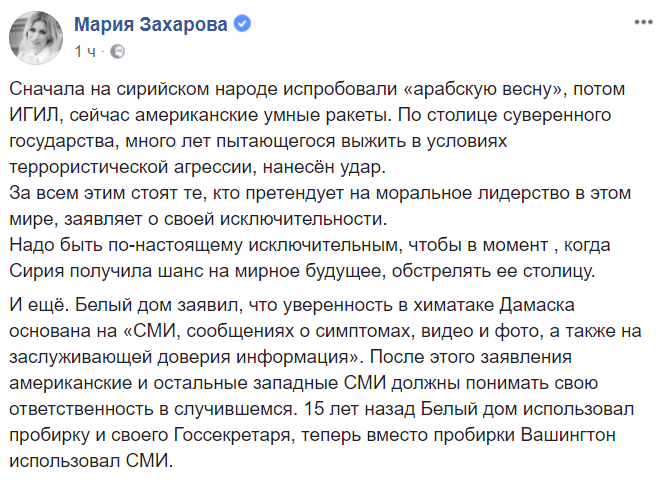 Сразу после атаки на нее отреагировала представитель МИД России Мария Захарова. Она заявила, что те, кто обстрелял столицу Сирии, "заявляют о своей исключительности".