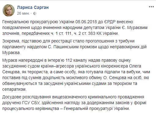 У Луценко отмечают, что "Мураев накануне в интервью 112 каналу предоставил правовую оценку осужденного судом страны–агрессора украинского кинорежиссера Олега Сенцова как террориста, а именно личность, которая готовила поджоги и взрывы, чем поставил под сомнение целесообразность возможного обмена О.Сенцова на лиц, которые обвиняются и осужденные украинскими судами за терроризм и сепаратизм".