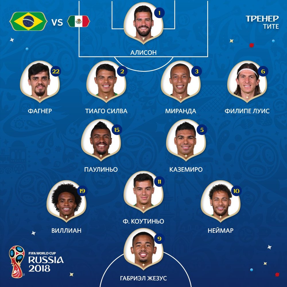 16.00 Стартовые составы. Как видим, Мексика внезапно с первых минут вывела капитана команды Рафаэля Маркеса. Видимо со старта бросают на Бразилию лучшие силы, чтобы устроить футбольный блицкриг.