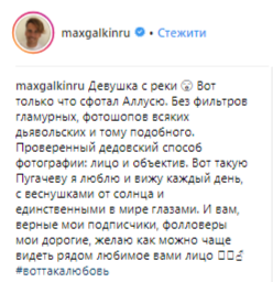 "Вот только сфотал Аллусю. Без фильтров гламурных, фотошопов всевозможных дьявольских и тому подобного. Проворный дедовский способ фотографии: лицо и объектив. Вот такую Пугачеву я люблю и вижу каждый день, с веснушками от солнца и единственными в мире глазами. И вам, верные мои подписчики, фоллоферы мои дорогие, желаю как можно чаще видеть рядом любимое вами лицо ", - пожелал он.