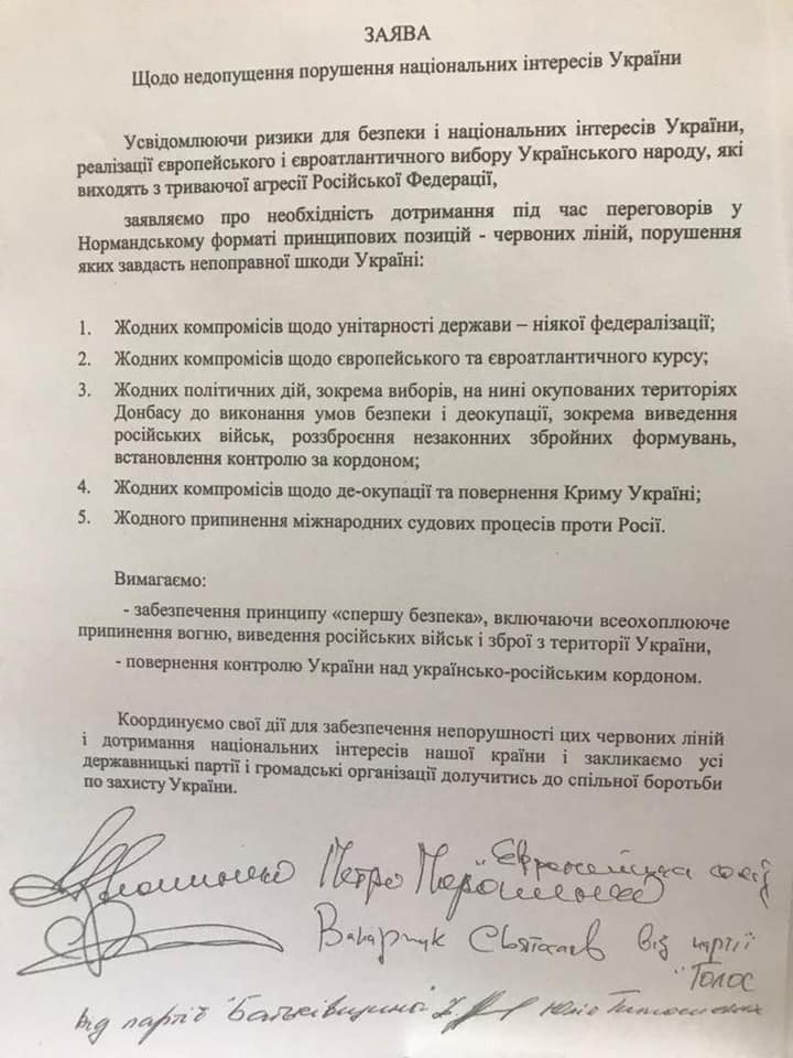 Вчера в Раде у трибуны столпились депутаты от Порошенко, Тимошенко и Вакарчука. Они зачитали ультиматум Зеленскому накануне нормандской встречи. Он состоит из пяти пунктов.