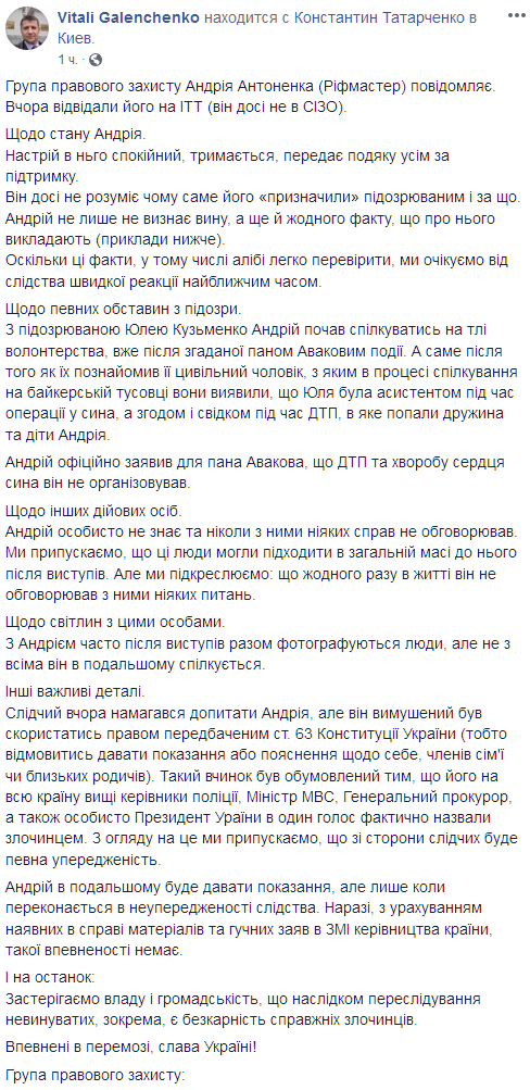 "Следователь вчера пытался допросить Андрея, но он вынужден был воспользоваться правом, предусмотренным ст. 63 Конституции Украины (то есть отказаться давать показания или объяснения в отношении себя, членов семьи или близких родственников). Такой поступок был обусловлен тем, что его на всю страну высшие руководители полиции, министр внутренних дел, генеральный прокурор, а также лично президент Украины в один голос фактически назвали преступником. Учитывая это, мы предполагаем, что со стороны следователей будет определенная предвзятость", - говорится в сообщении.