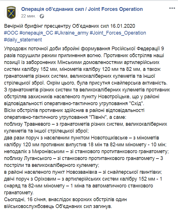 Вчера штаб ООС представлял похожую сводку: на Донбассе тоже 9 раз нарушали режим перемирия, погиб один украинский военный.