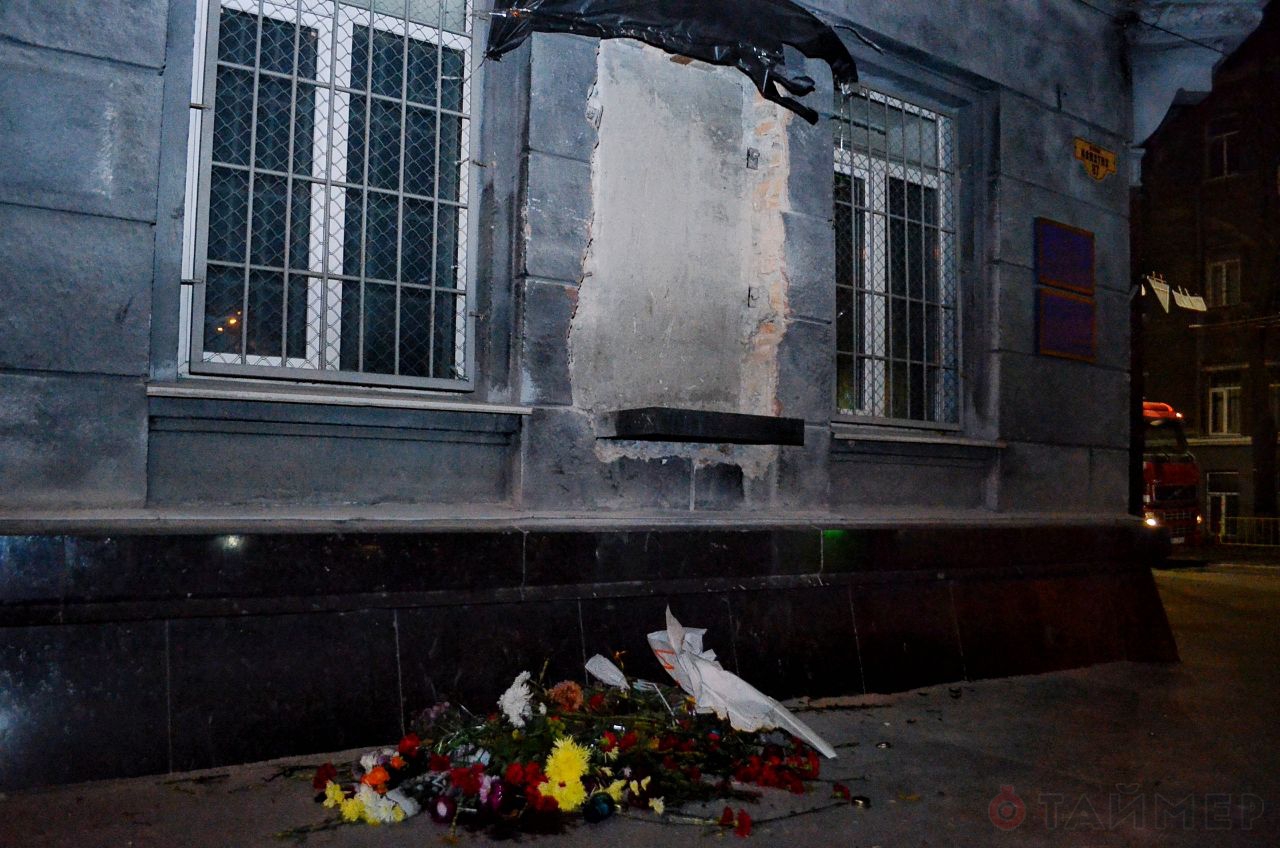 После сноса барельефа с военкомата одесситы собрались на акцию "Реквием по Жукову" и принесли к месту демонтажа цветы и лампадки.