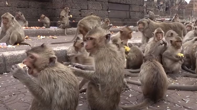 В таиландском городе Лопбури стаями бегают обезьяны (макаки-крабоеды) в поисках еды. Они громят магазины, нападают на фургоны с продуктами, воруют еду у людей. В связи с этим большинство жителей города закрылись в своих домах и стараются выходить на улицу только в крайних случаях.