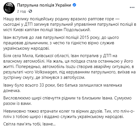 "Нашу большую полицейскую семью поразило внезапное горе - сегодня в ДТП погиб патрульный управления патрульной полиции в городе Киеве капитан полиции Иван Подольский. Иван вступил в ряды патрульной полиции в 2015 году, до этого работал участковым, с честью и достоинством верно служил украинскому народу", - говорится в сообщении.