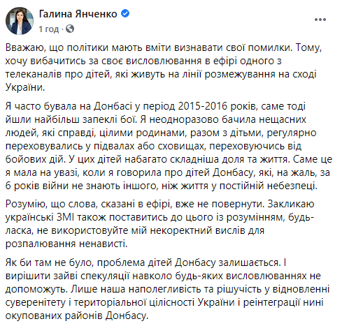 "Считаю, что политики должны уметь признавать свои ошибки. Поэтому, хочу извиниться за свое высказывание в эфире одного из телеканалов о детях, живущих на линии разграничения на востоке Украины", - заявила нардеп.