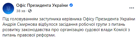 В Киеве под председательством заместителя руководителя Офиса президента Андрея Смирнова состоялось заседание новой рабочей группы. Она будет заниматься развитием законодательства, связанного с организацией судебной власти, при комиссии по вопросам правовой реформы.