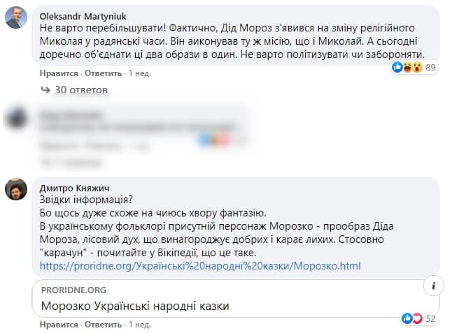"Не надо преувеличивать! На самом деле, Дед Мороз пришел на смену религиозному Николаю в советское время. Он выполнял ту же миссию, что и Николай. И сегодня уместно объединить эти два образа в один. Не политизировать и не запрещать", - пишет пользователь Александр Мартынюк.