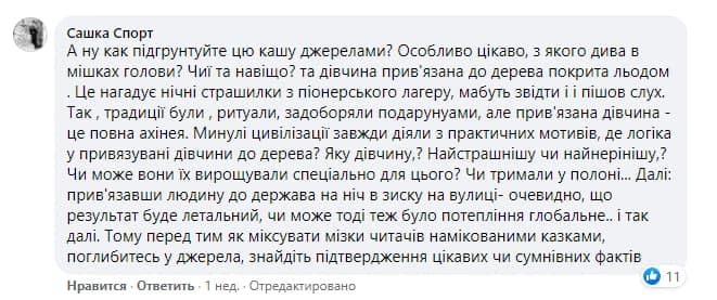 "А ну-ка обоснуйте эту кашу источниками? Особенно интересно, с какого чуда в мешках головы? Чьи и почему? Эта девушка, привязанная к дереву и покрытая льдом. Это напоминает ночные страшилки из пионерского лагеря, по-видимому оттуда и пошел слух. Да, традиции были, ритуалы, задабривали подарками, но связанная девушка - это полный ахинея. Прошлые цивилизации всегда действовали исходя из практических мотивов, где логика привязывания девушки к дереву? Какая девушка? Самая страшная? Или может они выращивали их специально для этого? Или держали в плену ... Далее: привязать человека к дереву на ночь на улице - очевидно, что результат будет смертельным, или же тогда тоже было потепление глобальное... и так далее. Поэтому, прежде чем смешивать мозги читателей с измененными сказками, углубитесь в источники, найдите подтверждение интересных или сомнительных фактов", - советует еще один подписчик.