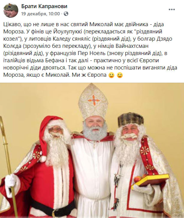 "Интересно, что не только у нас святой Николай имеет двойника - деда Мороза. У финнов это Йоулупукки (переводится как "рождественский козел"), у литовцев Каледа сянялис (рождественский дед), у болгар Дзядо Коледа (разумеется без перевода), у немцев Вайнахтсман (рождественский дед), у французов Пер Ноэль (опять рождественский дед), у итальянцев ведьма Бефана и так далее - практически у всей Европы новогодние деды двоятся. Так что можно не спешить выгонять деда Мороза, если есть Николай. Мы же Европа", - говорится на странице братьев Капрановых.