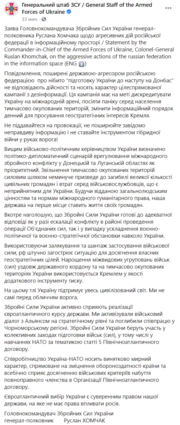 16:02 Главком ВСУ Руслан Хомчак выпустил официальное заявление, в котором говорится, что сообщения о подготовке Украины к наступлению на Донбассе не соответствуют действительности и являются дезинформацией.