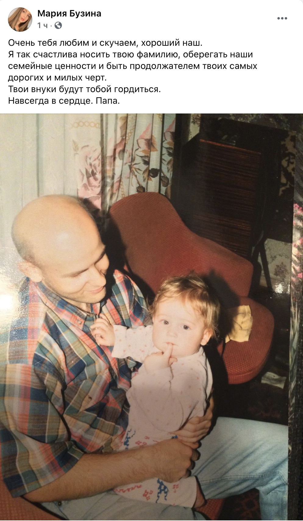 "Очень тебя любим и скучаем, хороший наш. Я так счастлива носить твою фамилию, оберегать наши семейные ценности и быть продолжателем твоих самых дорогих и милых черт. Твои внуки будут тобой гордиться. Навсегда в сердце. Папа", - написала на своей странице в Фейсбуке дочь Олеся Бузины Мария.
