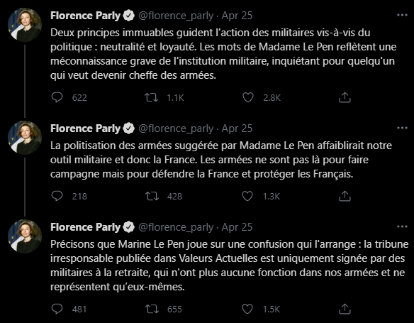 Министр вооруженных сил Флоренс Парли заявила в своем Twitter, что отставные генералы больше не играют никакой роли в ВС Франции и представляют только свою точку зрения. Парли также раскритиковала Ле Пен, обвинив политика в серьезном незнании устройства армии, "что весьма тревожно, учитывая, что она хочет стать главнокомандующим".