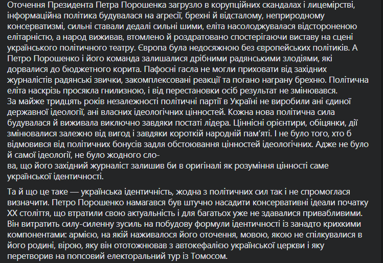 "Петр Порошенко пытался искусственно насадить консервативные идеалы начала ХХ века, которые потеряли свою актуальность и для многих уже не казались привлекательными. Он потратил уйму усилий на построение формулы идентичности со слишком хрупкими компонентами: армией, на которой наживалось его окружения, языке, которым не общались в его семье, вере, которую он отождествлял с автокефалии Украинской Церкви и которую превратил в попсовый электоральный тур с Томосом", - пишет Мендель.