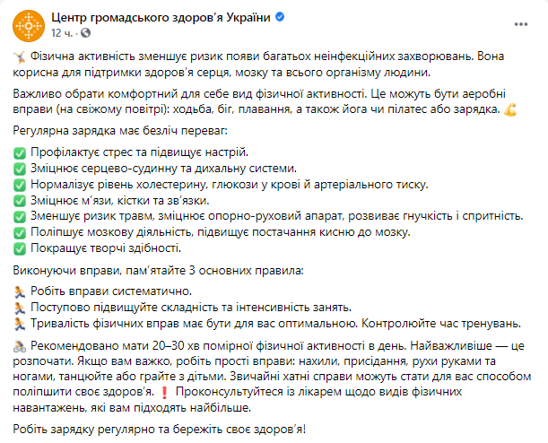 В Минздраве украинцам рекомендуют укреплять свое здоровье, выбрав для себя комфортный вид физической активности, которая снижает риск появления многих неинфекционных заболеваний, укрепляет сердце, полезна для здоровья мозга и всего организма человека.
