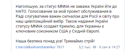 "И голосование за мой проект обращения в Раде будет служить важным сигналом для России и мира о нашем цивилизационном выборе. Также предоставление Украине статуса MNNA продемонстрирует Кремлю, что Украина является ключевым союзником США в Восточной Европе", - говорится в сообщении Гончаренко.