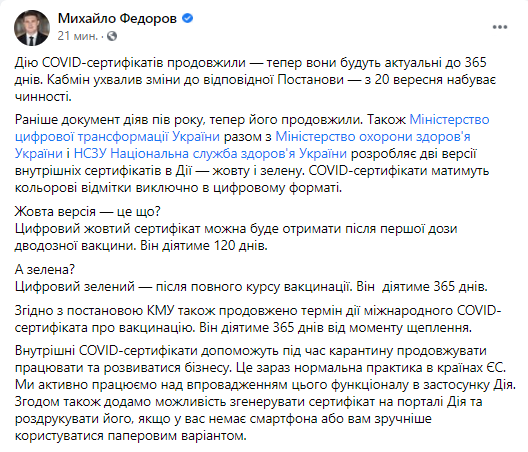 Также Федоров подтвердил, что его ведомство вместе с Минздравом и Национальной службой здоровья Украины разрабатывает две версии внутренних сертификатов - желтую и зеленую. COVID-сертификаты будут иметь цветные отметки исключительно в цифровом формате.