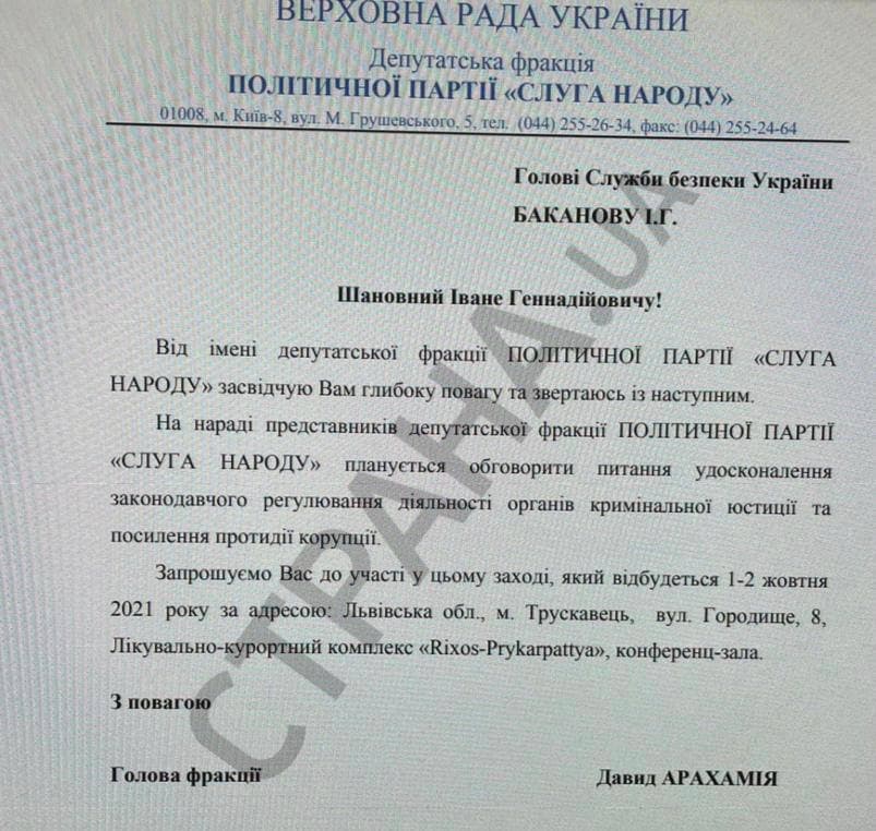 В опубликованном документе, который подписан именем главы парламентской  фракции "Слуги народа" Давида Арахамии, сообщается причина, по которой на совещании хотят видеть главу СБУ.