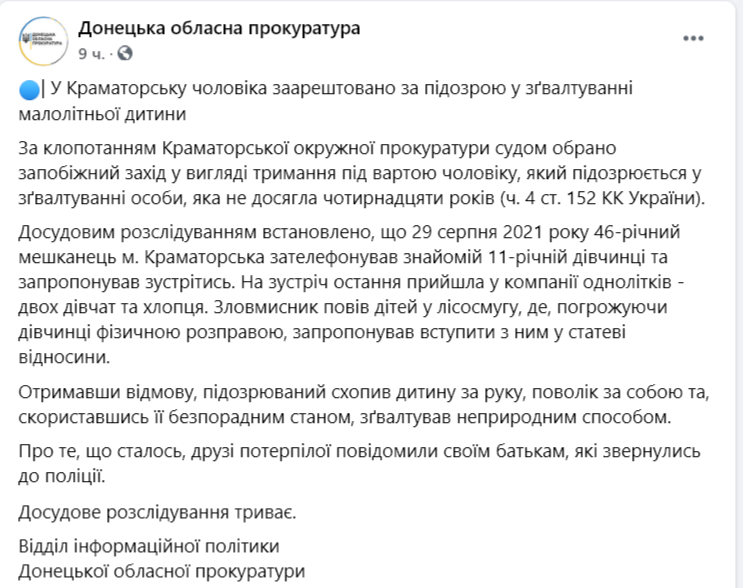 В сообщении прокуратуры говорится, что по ходатайству Краматорской окружной прокуратуры судом избрана мера пресечения в виде содержания под стражей мужчине, подозреваемому в изнасиловании лица, не достигшего четырнадцати лет (ч.4 ст.152 УК Украины).