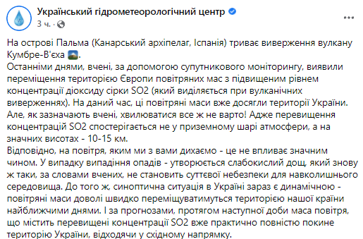 "По словам ученых, он не представляет существенной опасности для окружающей среды. К тому же, синоптическая ситуация в Украине сейчас является динамической - воздушные массы довольно быстро будут перемещаться по территории нашей страны в ближайшие дни. И по прогнозам, в течение следующих суток масса воздуха, содержащего превышены концентрации SO2 уже практически полностью покинет территорию Украины, отходя в восточном направлении", - говорится в сообщении.