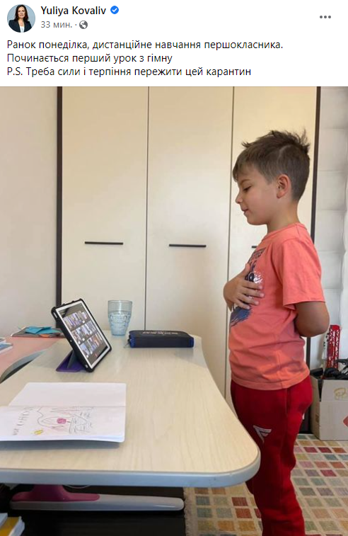 P.S. Надо силы и терпение пережить этот карантин", - написала в Facebook бывшая сотрудница Офиса президента Юлия Ковалив, опубликовав фото первоклассника, который слушает гимн Украины через планшет.