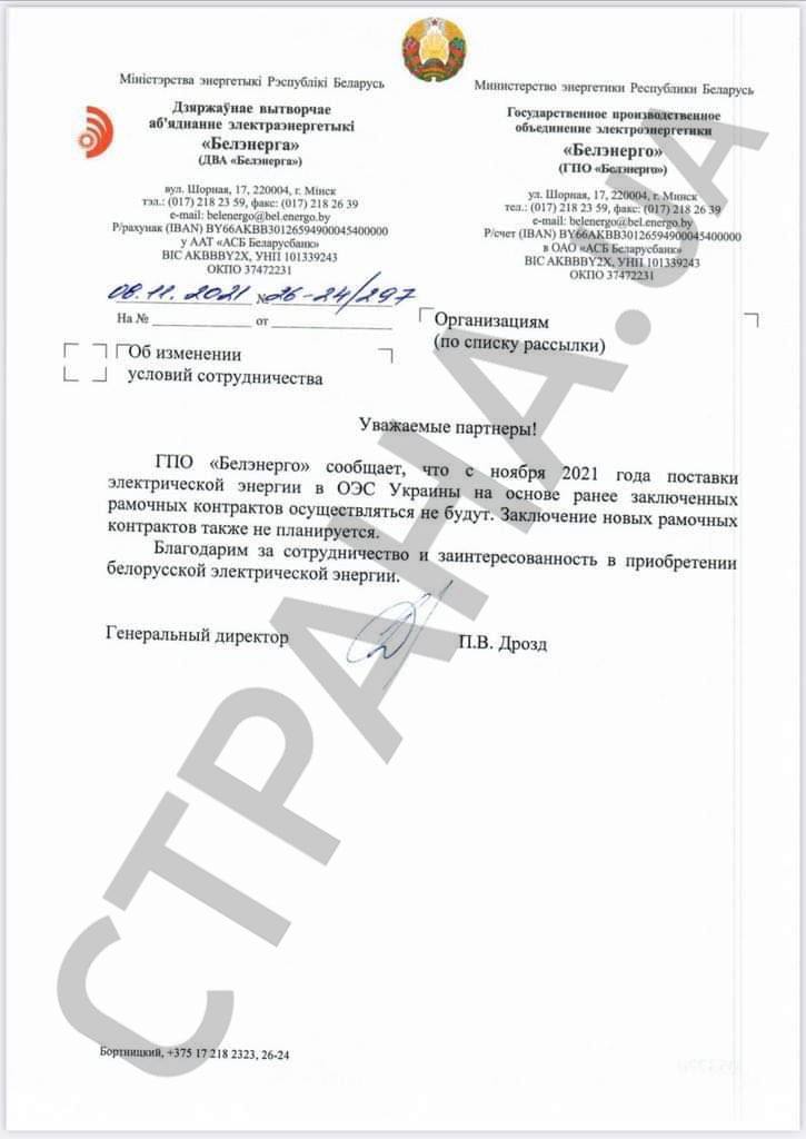 "ГПО "Белэнерго" сообщает, что с ноября 2021 года поставки электрической энергии в ОЭС Украины на основе ранее заключенных рамочных контрактов осуществляться не будут. Заключение новых рамочных контрактов также не планируется", - говорится в документе.