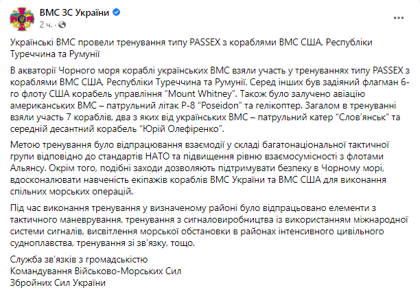 Также, как считают в украинских ВМС ВС, подобные меры позволяют поддерживать безопасность в Черном море и совершенствовать обучение экипажей кораблей ВМС Украины и ВМС США для выполнения совместных морских операций.