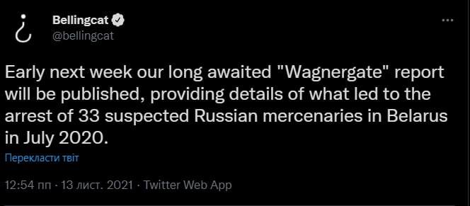 "В начале следующей недели будет опубликован наш долгожданный отчет "Вагнергейт", в котором подробно описывается, что привело к аресту 33 подозреваемых российских наемников в Беларуси в июле 2020 года", - говорится в сообщении.
