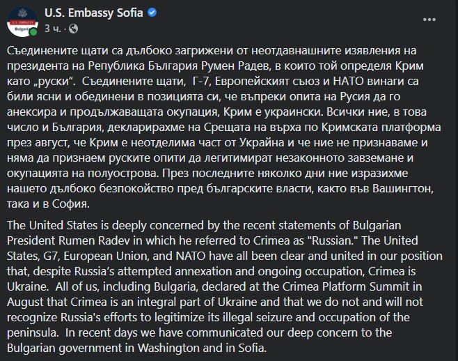 Об этом свидетельствует заявление посольства США в Болгарии на официальной странице Fcebook.