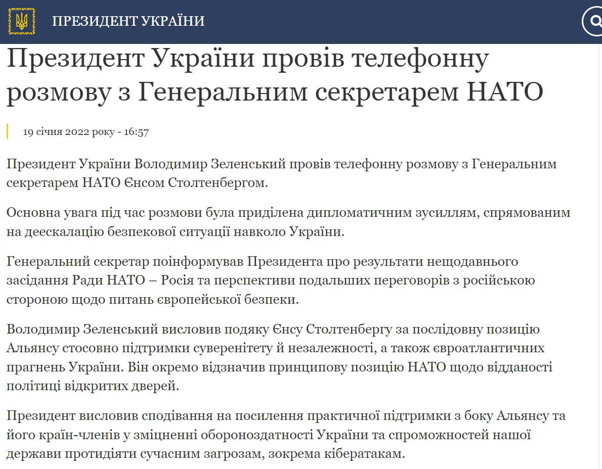 Президент Украины Владимир Зеленский провел телефонный разговор с Генеральным секретарем НАТО Йенсом Столтенбергом. Основное внимание было уделено вопросу деэскалации ситуации вокруг Украины.