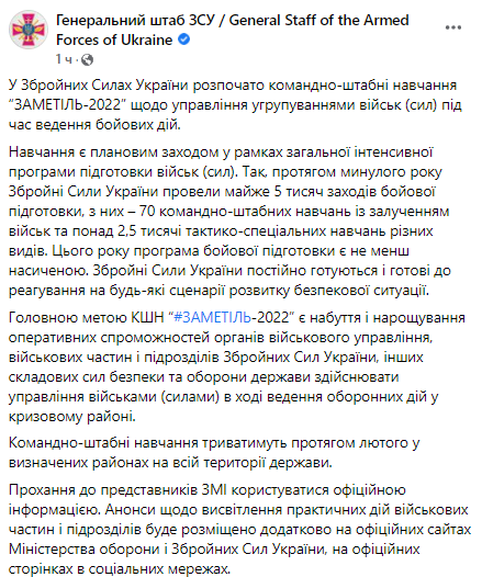 Командно-штабные учения будут продолжаться в течение февраля в определенных районах по всей территории Украины.