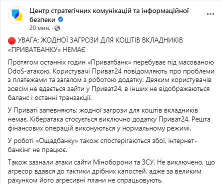 "В последние часы "Приватбанк" находится под массированной DDS-атакой. Пользователи Приват24 сообщают о проблемах с платежами и, в целом, с работой приложения. Некоторым пользователям совсем не удается зайти в Приват24, у других не отображаются баланс и последние транзакции. В Привате уверяют: никакой угрозы для средств вкладчиков нет. Кибератака касается исключительно приложения Приват24. Остальные финансовые операции выполняются в нормальном режиме. В работе Ощадбанка также наблюдаются сбои, интернет-банкинг не работает. Также атаковали сайты Минобороны и ВСУ. Не исключено, что агрессор прибег к тактике мелких пакостей, ведь по большому счету его агрессивные планы не срабатывают", - говорится в сообщении.