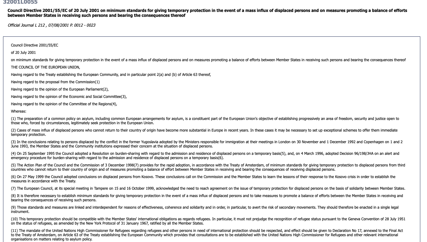 В четверг, 3 марта, в Брюсселе главы МИД 27 стран ЕС единогласно решили активировать так называемую Директиву о временной защите от 20 июля 2001 года. Закон, который приняли еще после балканских войн, задействуют впервые для украинских беженцев. Вот ссылка на эту директиву на английском языке.